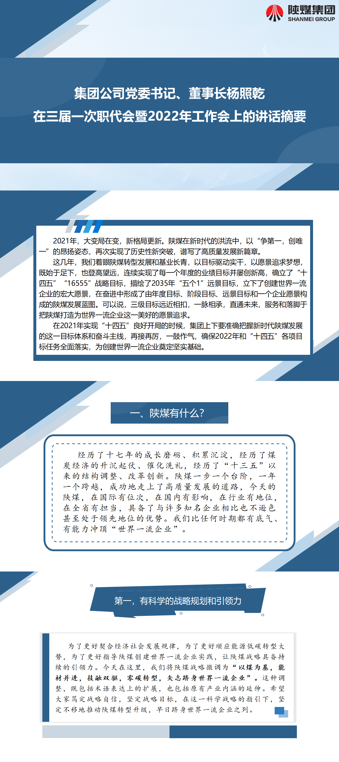 集团公司党委书记、董事长杨照乾在三届一次职代会暨2022年工作会上的讲话摘要
